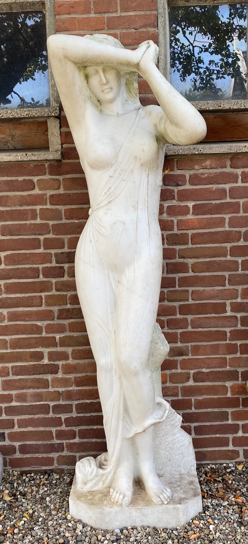 Schitterend groot uitgevoerde marmeren tuinbeeld van schone jonge dame, uit de Griekse mythologie.
